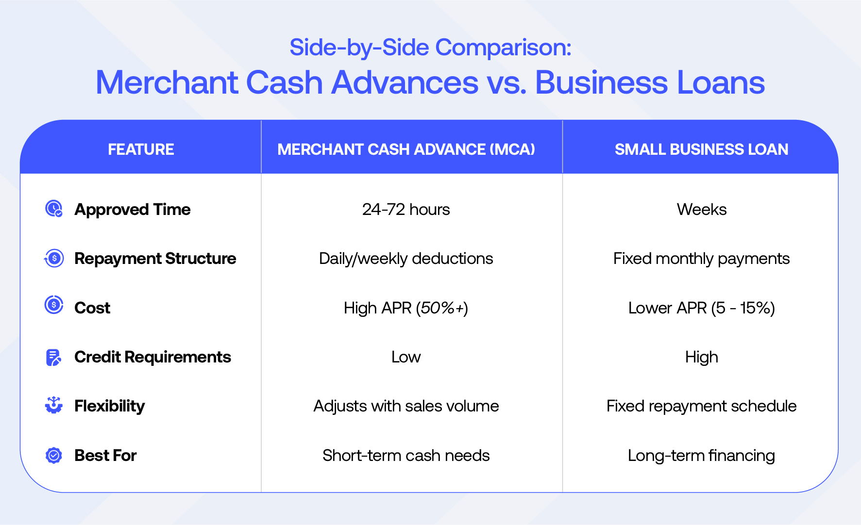 Side-by-Side Comparison: Merchant Cash Advances vs. Business Loans