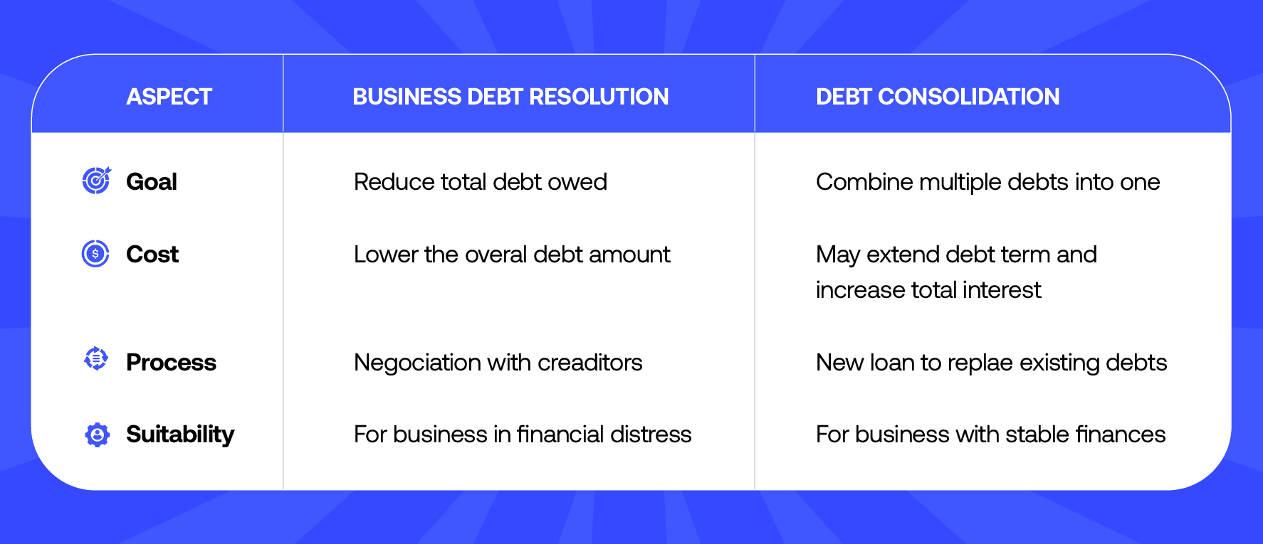Business debt resolution is the process of working with creditors to reduce the total amount owed or renegotiate payment terms. Unlike debt consolidation, which combines multiple debts into a single loan, debt resolution focuses on settling existing debts, often for less than the original amount.